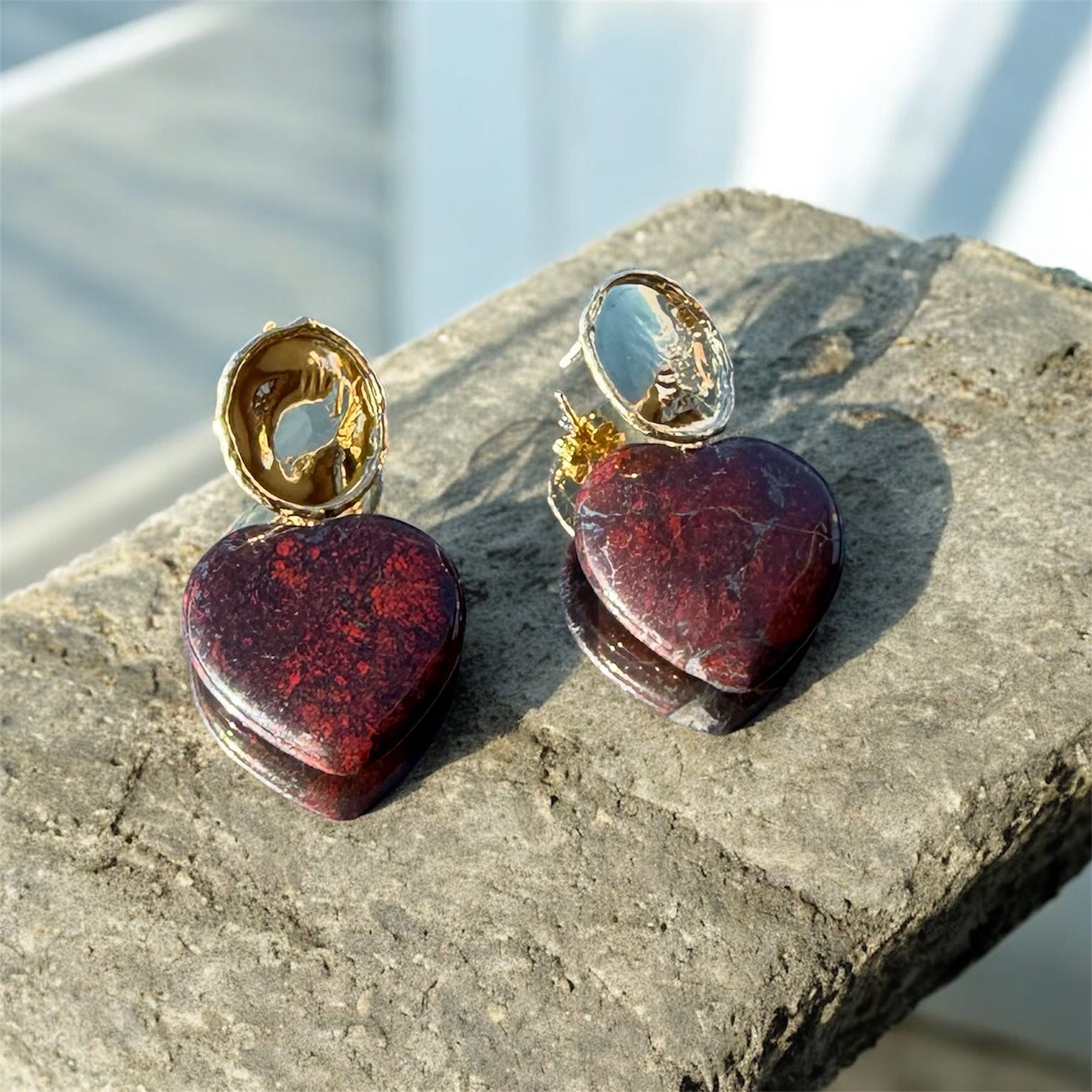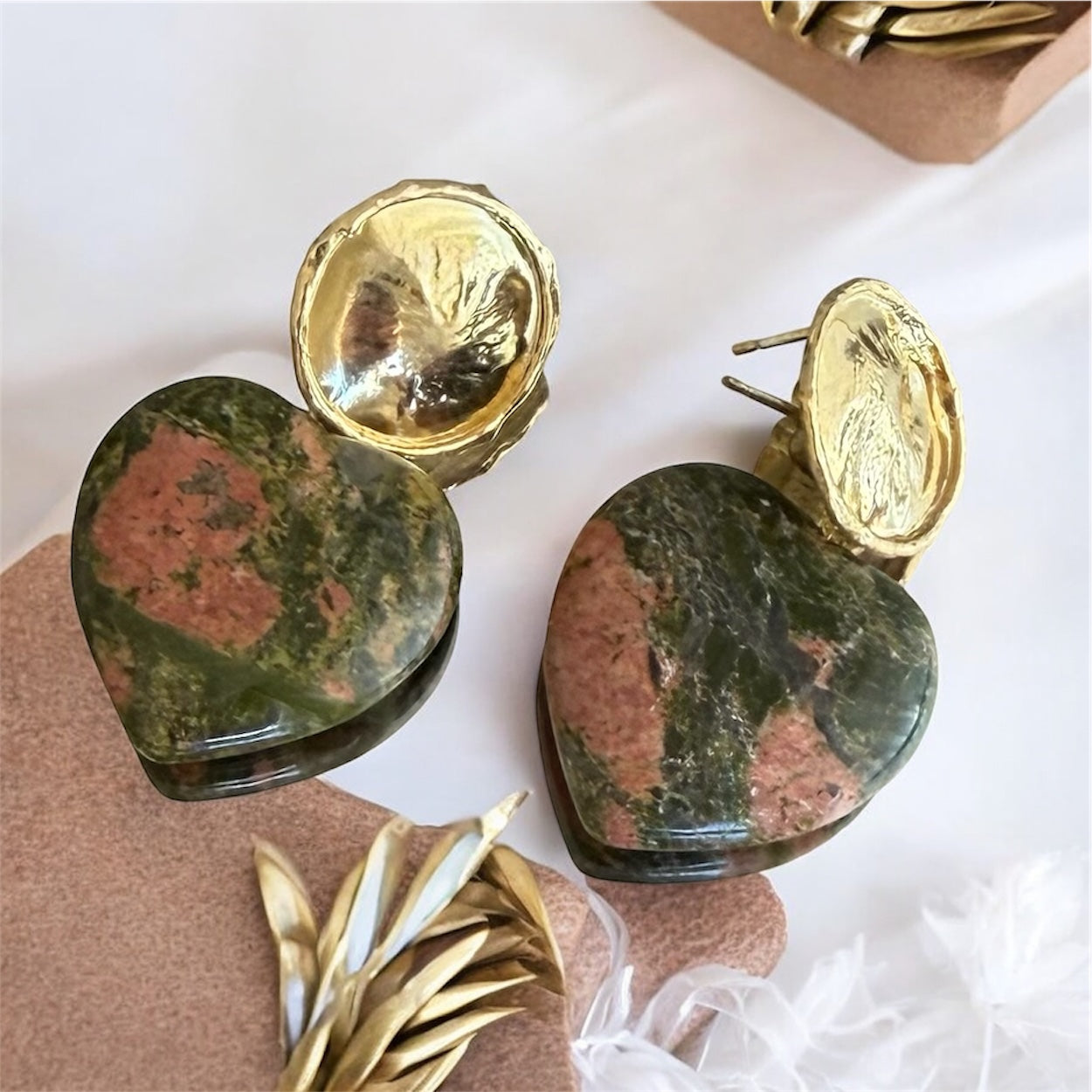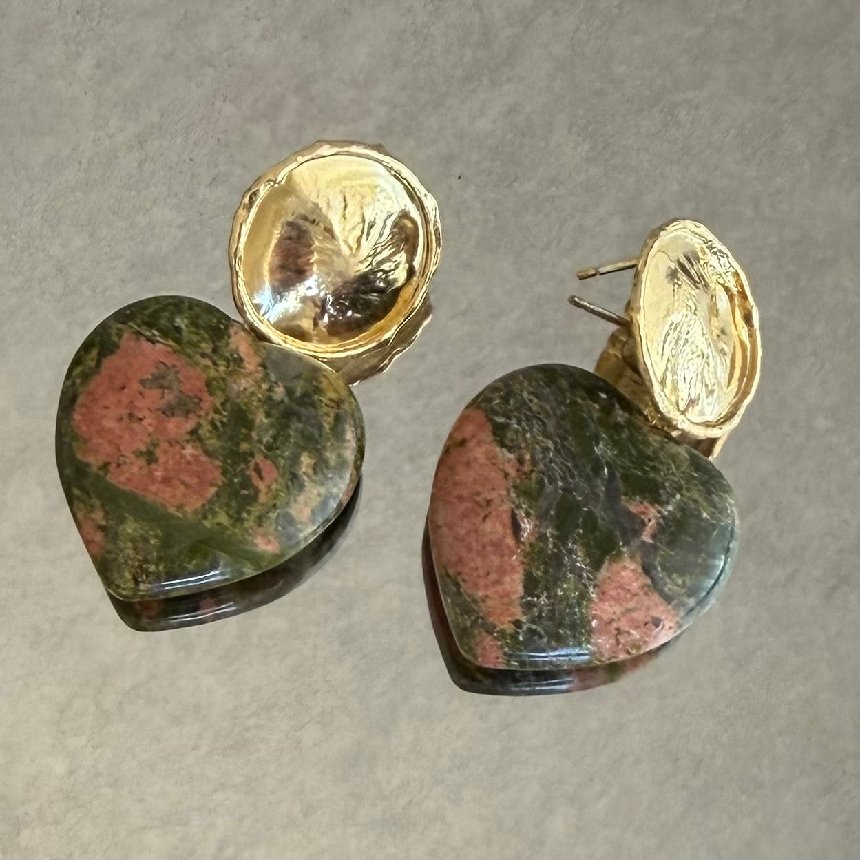 Pendientes de unakita natural hechos a mano, con tonalidades verde olivo y terracota o jaspe en tonalidades de granate . Cada par es único gracias a las vetas naturales de la piedra. Diseño en forma de corazón con detalles dorados que aportan luz y sofisticación. Una pieza artesanal, en tendencia este año, ideal para regalar o para elevar cualquier look.
